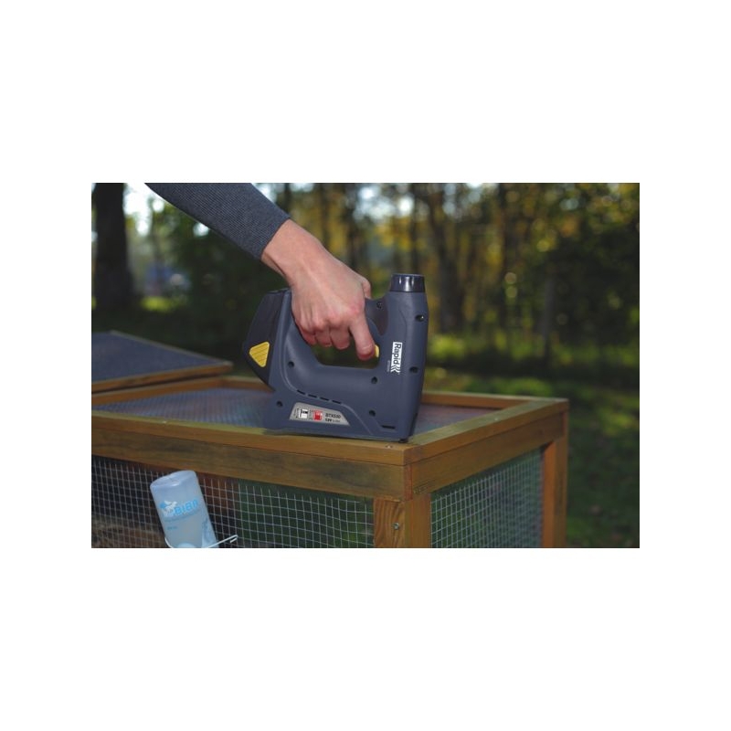Pour textile, cuir, petite menuiserie, étiquetage, tissu dameublement, tapisserie. Utilise des agrafes n°53 de 6 à 14 mm et des pointes n°8 de 15 mm. Livrée dans une mallette avec une batterie déjà chargée pour deux heures et demi dutilisation.
