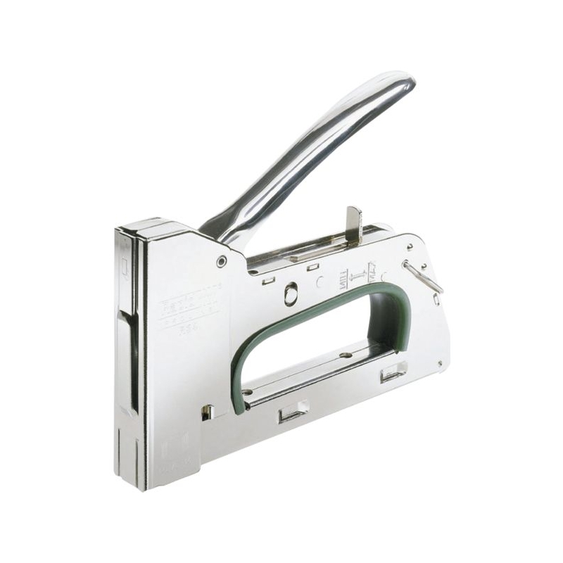Convient pour la pose de dalles de plafond, de revêtements plastiques, de matériaux isolants. Corps acier chromé. Réglage de force 3 niveaux. Système antirecul. Chargement par le dessous. Utilise des agrafes n°140 de 6 à 14 mm. Chargeur : 84 agrafes Poids : 820 g