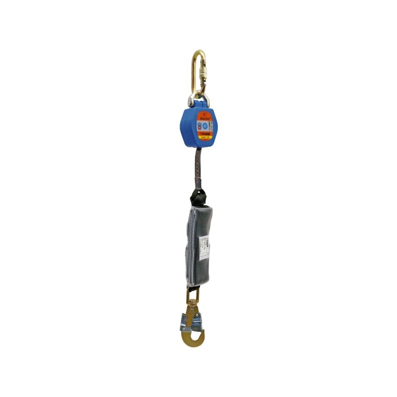 S'utilise à la verticale et à l'horizontale. Connecteur de type M10 en extrémité de carter. Carter en polyamide chargé de fibres ABS. Sangle en aramide largeur 15 mm longueur 1,45 m. Équipé dun dissipateur dénergie ESD (Extremity System Dissipator) en sangle à déchirure, portant létiquette avec les données de traçabilité de lappareil et faisant fonction de témoin de chute. Assure à lutilisateur un impact inférieur à 600 daN même dans les cas où la sangle est complètement déroulée. Connecteur tourillonnant de type M47 en extrémité de dissipateur. Norme : CE Cat III - EN 360