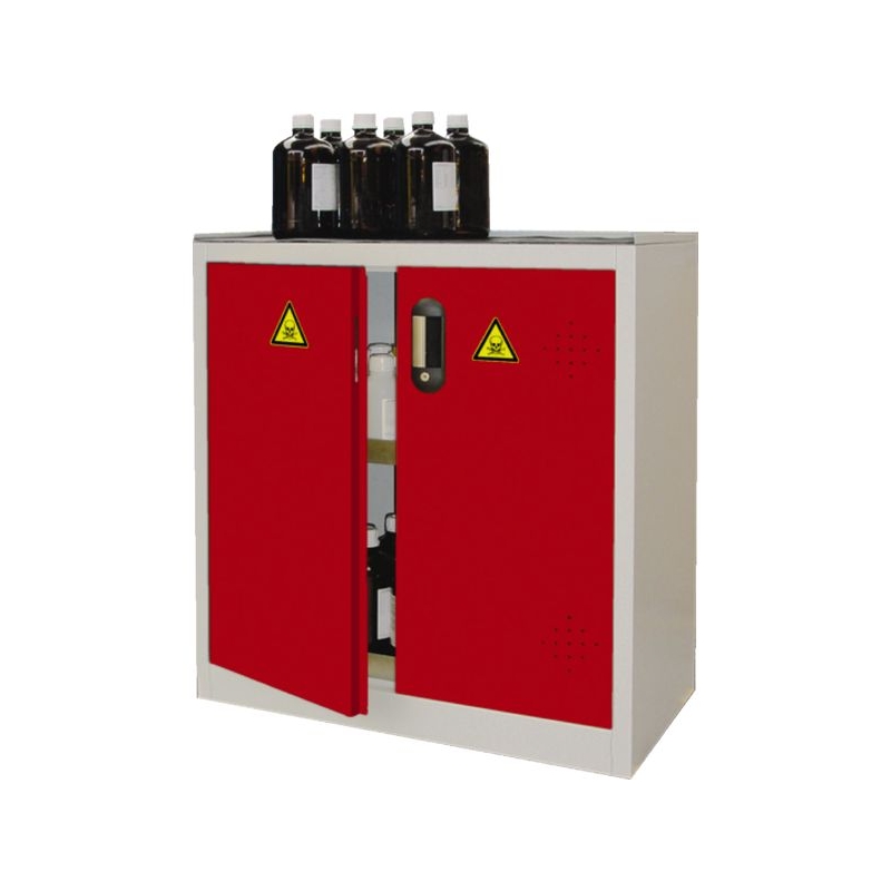 En acier monobloc avec portes battantes à 110°. Fournie avec pictogrammes normalisés. Orifices de ventilation. Fermeture à clé en 3 points. Étagères et bacs de rétention réglables en hauteur sur crémaillères, au pas de 15 mm. Armoire haute à 4 étagères ou basse à 2 étagères. Plan de travail des armoires comptoirs recouvert par un tapis en caoutchouc. Conforme aux articles R5132-66 et R5132-68 du Code de la Santé Publique. Conforme aux recommandations de l'INRS. Charge admissible par étagère : 80 kg UR Coloris : corps gris et portes jaunes Existe avec portes rouges, bleues ou vertes, nous consulter.