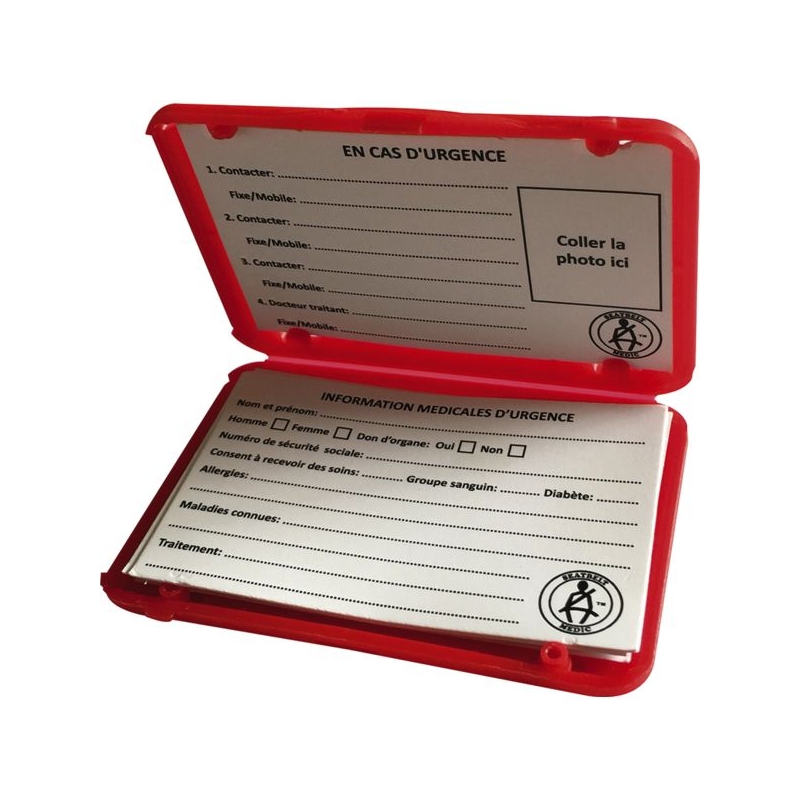 Facile à clipser à la ceinture ou au harnais, ce boîtier plastique contient les informations médicales et la photo du porteur. Composé de : - 1 boîtier - 2 lots de cartes dinformation à compléter manuellement - 1 autocollant de parebrise.