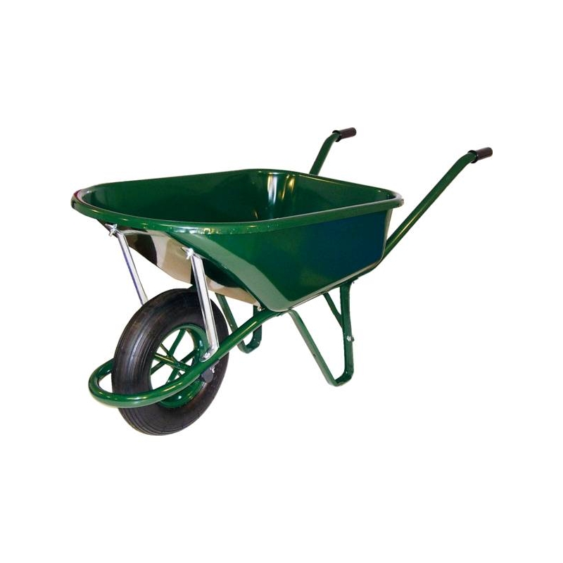 Pour les travaux du bâtiment et de la rénovation. Caisse peinte verte 110 L, épaisseur 1,2 mm, bord roulé. Étroite (60 cm) et profonde, étudiée pour le passage de portes. Châssis en tube peint Ø 32 mm, renforcé par 2 haubans à l'avant et 1 traverse sous coffre. Piètement profilé boulonné. Roue gonflée Ø 400 mm, jante acier. Charge utile : 200 kg Poids : 14,500 kg