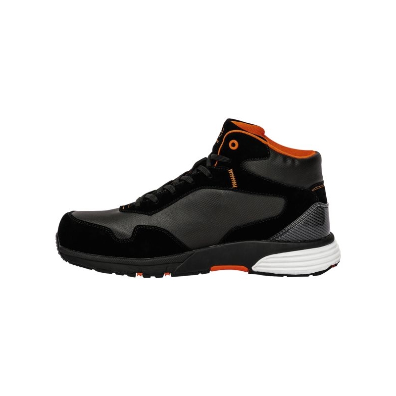 Tige en microfibre et croute de cuir, hydrofuge. Doublure en textile. Première de propreté anatomique et amovible en maille sur mousse PU. Semelle d'usure en caoutchouc / EVA. Semelle antiperforation textile. Embout de sécurité en composite. Poids : 588 g Coloris : noir/orange Pointure : 39 au 48 Norme : CE Cat II - EN ISO 20345 - S3 HRO SRC