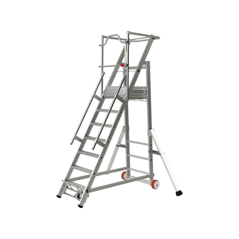 Pour les entrepôts, rayonnages et palettiers. Usage intensif. En aluminium. Plateforme de 600 x 480 mm avec plinthes intégrées. Garde-corps rigide 360°. Marches de 100 mm. Porte-outils intégré. Rampes d'accès et stabilisateurs réglables. 3 roues de déplacement Ø 160 mm dont une entièrement directionnelle. Charge maxi. : 150 kg Norme : Décret 2004-924