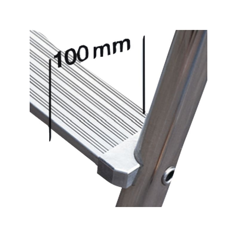 Spécialement étudié pour un emploi dans des conditions extrêmes. Usage ultra-intensif BTP. En aluminium. Marches striées antidérapantes de 100 mm. Plateforme de 390 x 382 mm. Montant en tube rond Ø 50 mm. Liaison montant/marche anti-rotation, repose-pieds repliable en alu extrudé. Sabots enveloppants antidérapants. Porte-outils avec porte-seau intégré. Charge maxi. : 150 kg Norme : EN 131 - décret 96 333