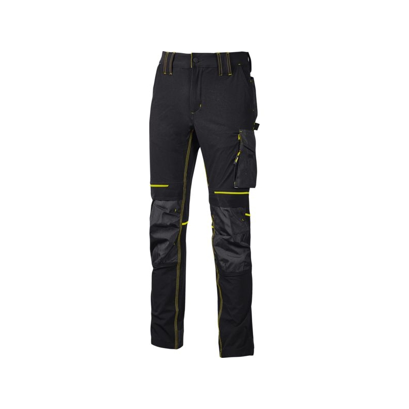 90% nylon, 10% spandex, 260 gr/m2. Tissu stretch, doux au toucher, déperlant, respirant, séchage rapide. Taille élastiquée, bavette à larrière pour une meilleure protection lombaire. Poches latérales porte-outils, multifonction avec porte badge rétractable, 2 poches arrières, poches zippées sous une grande poche latérale. Emplacements pour genouillères réf. 103541 (à commander séparément). Bas de pantalon entièrement renforcé en polyoxford 600D. Coloris : noir/jaune, marine/orange Taille : M à 2XL Norme :