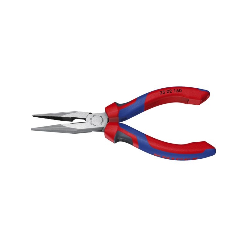 Pour les travaux nécessitant une prise et une coupe de précision. Mâchoires pointues 1/2 rondes. Bec coudé à 40°. Intérieur des mâchoires strié. Tranchants pour fil doux, mi-dur Ø 2,5 mm et dur Ø 1,6 mm. Longueur : 160 mm