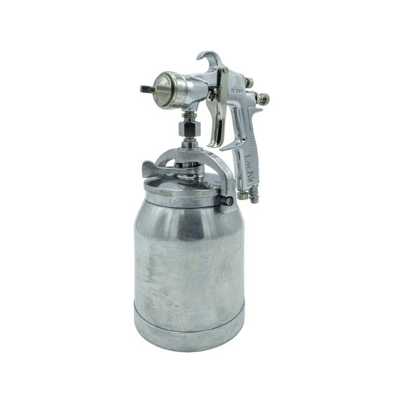 Travaux de maintenance. Poignée ergonomique en aluminium. Ensemble buse 1,8 mm. Godet aluminium 1 L. Couvercle avec fermeture autoclave. Réglages débit air, peinture et largeur du jet. Consommation air : 250 l/mn Poids : 0,9 kg Raccord entrée d'air : 1/4'' Pression d'utilisation : 3-4 bar Largeur jet maxi. : 250 mm Consommation moyenne produit : 260 cm³/mn
