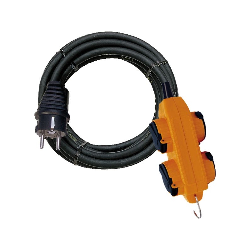 4 prises 2P+T - 16 A - 230 V à clapets. 1 fiche 2P+T 16 A - 230 V. Peut se suspendre grâce à son crochet métallique rabattable. Câble H07RNF 3G2,5 mm². Longueur de câble : 5 m Indice de protection : IP44