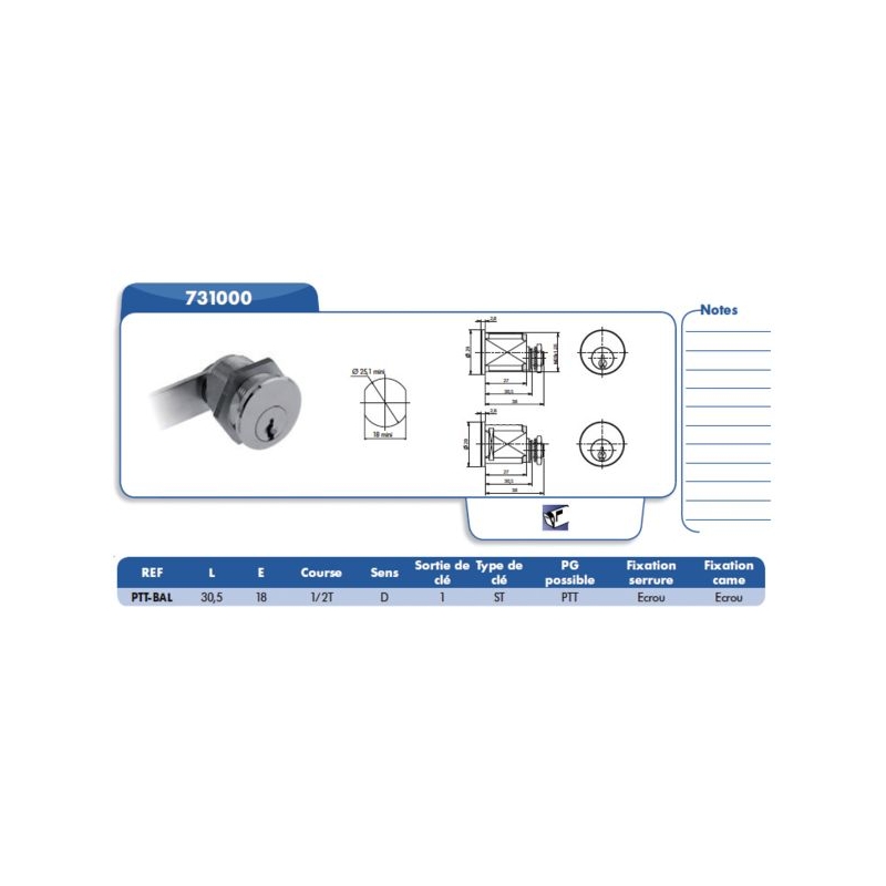 Fonctionne sur le passe PTT T10 national. Rotation ½ tour - droite. 1 sortie de clé. Fixation par écrou. Livré avec 2 clés, écrou de fixation et came 129496.