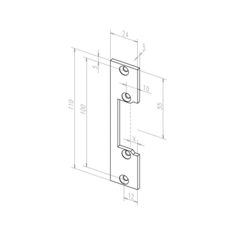 Pour gâches électriques PROFIX: 53914 / 53915 / 53916 / 53917 / 53920 / 53921. Réversible. Dimensions : 110 x 24 x 3 mm Finition : zinguée Conditionnement : boite