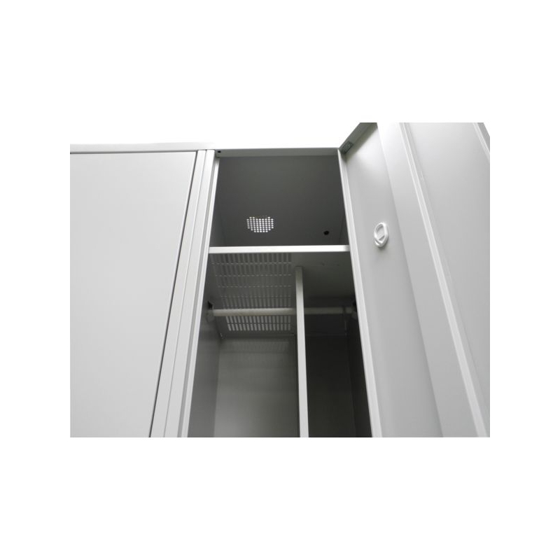 Pour sécher les vêtements de travail. Temps de séchage de vêtements humides estimé en 4-5h. En tôle acier, peinture époxy avec traitement anti-corrosion. Pieds avec vérins de réglage. Tablette soudée, penderie avec cloison de séparation pour vêtements de ville et vêtements de travail. Porte renforcée, fermeture par verrou cadenassable. Aérations. Vestiaires connectables en série. Débit dair : 150 m³/h Temporisation : 5 h L x H x P : 800 x 1940 x 490 mm Options, version 1000 W et sur socle banc, sur consultation.