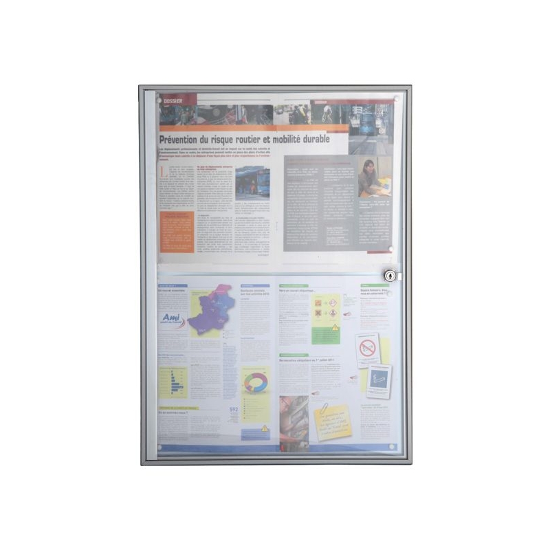 Porte battante, fermeture par serrure à clé avec pose à droite. Profil alu anodisé naturel, façade plexiglas avec entourage à partir du format 6 feuilles. Fond tôle blanc pour affichage magnétique. Fixation murale 4 points. Absence d'entourage de porte pour le format 4 feuilles. Épaisseur hors-tout : 20 mm Épaisseur utile : 12 mm